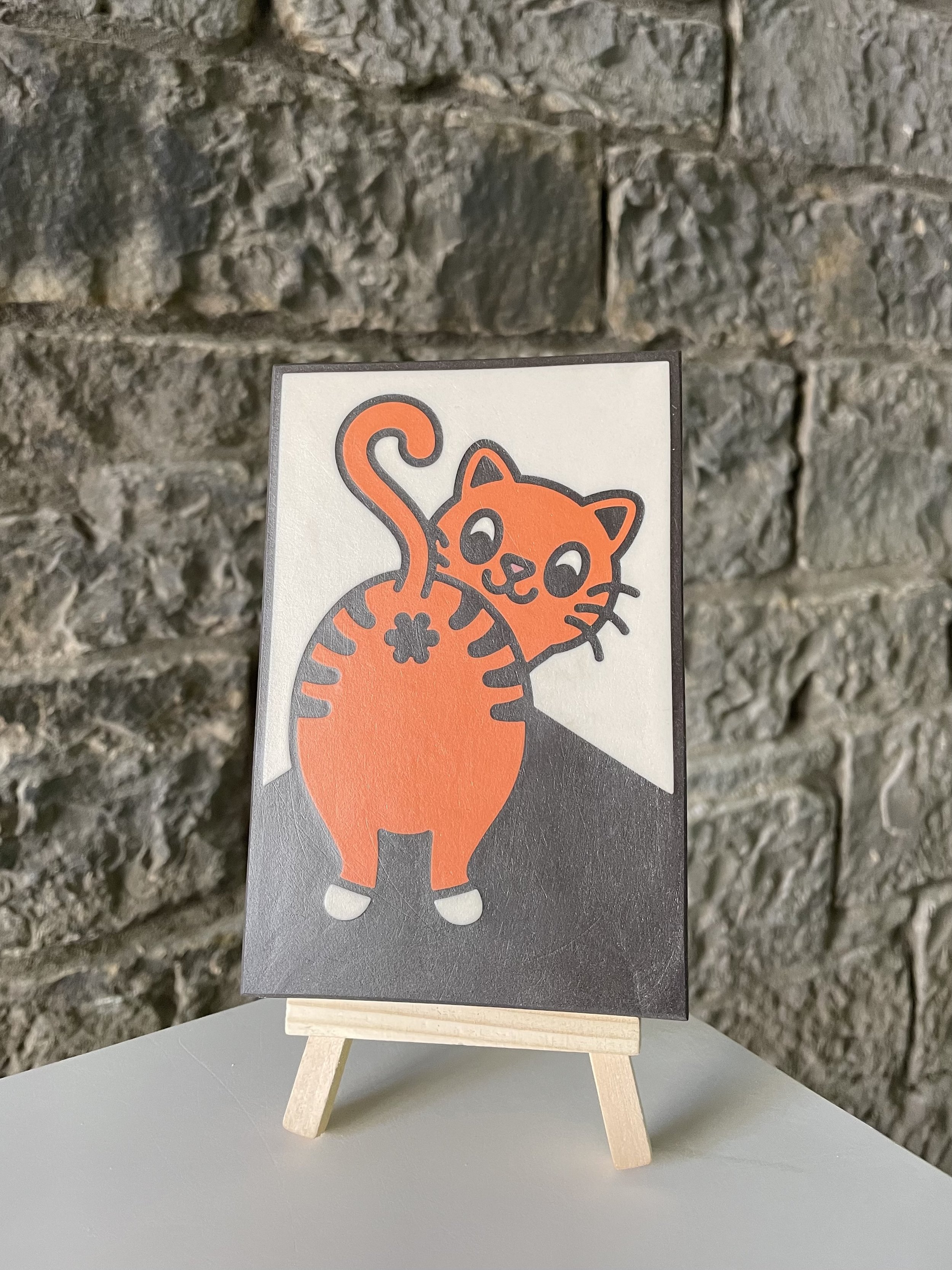 A Crafty Cat standing proud on her display easel - Included with every tile